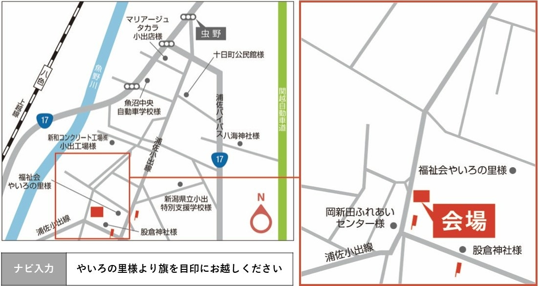 ナビ入力:やいろの里様より旗を目印にお越しください
